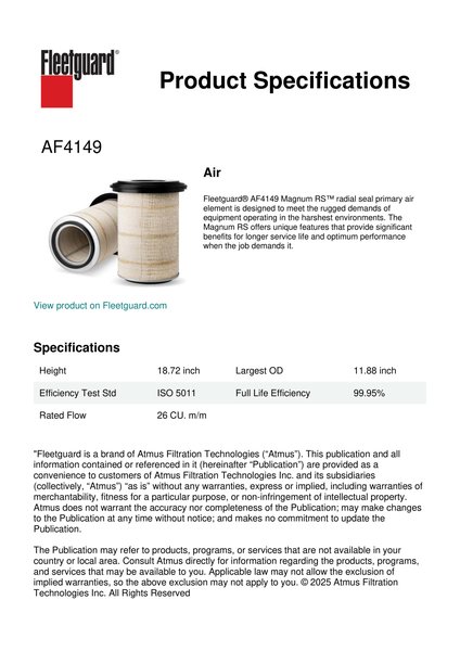 Fleetguard® AF4149 Magnum RS™ radial seal primary air element is designed to meet the rugged demands of equipment operating in the harshest environments. The Magnum RS offers unique features that provide significant benefits for longer service life and optimum performance when the job demands it.Specification
