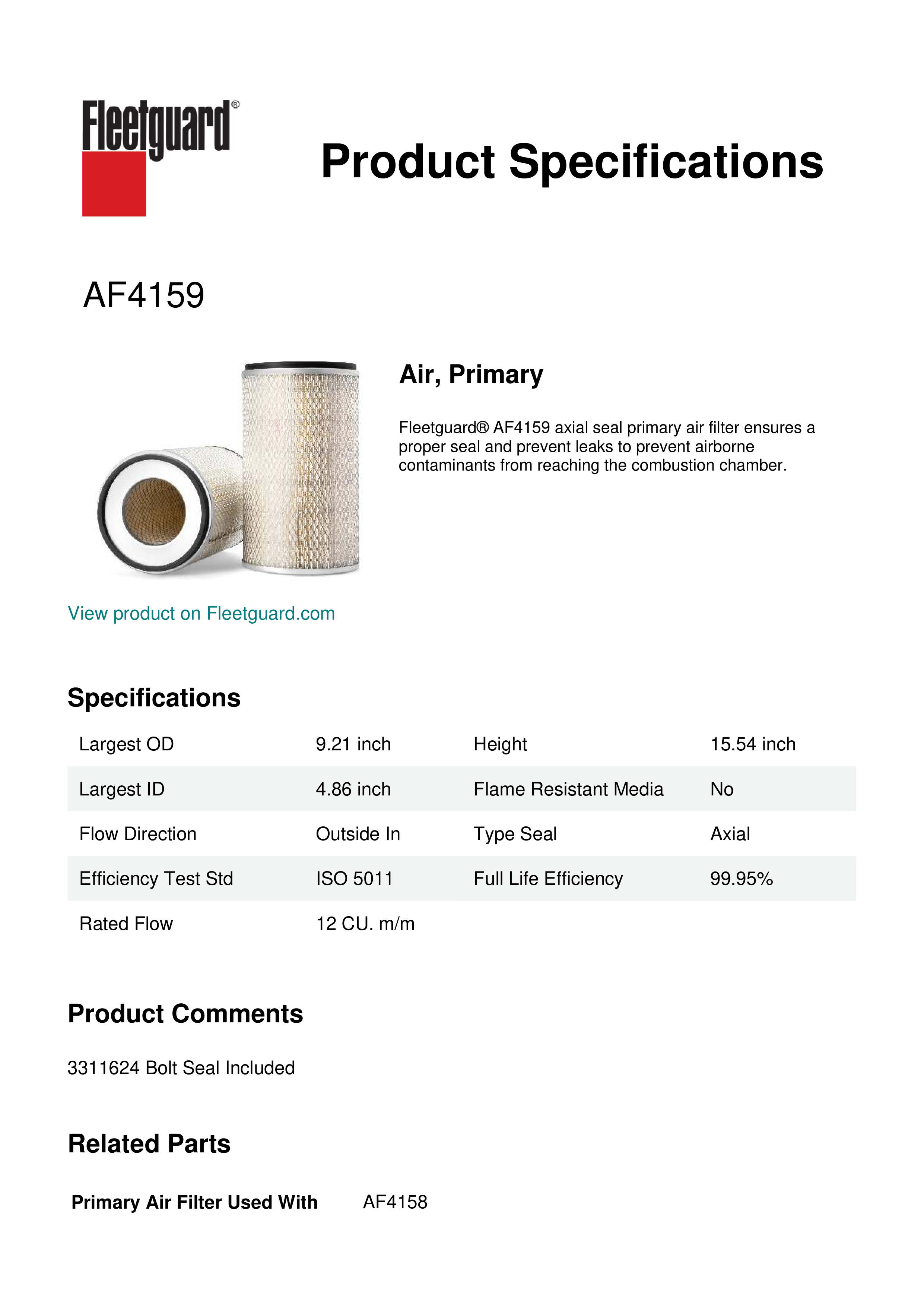 Fleetguard® AF4159 axial seal primary air filter ensures a proper seal and prevent leaks to prevent airborne contaminants from reaching the combustion chamber.
