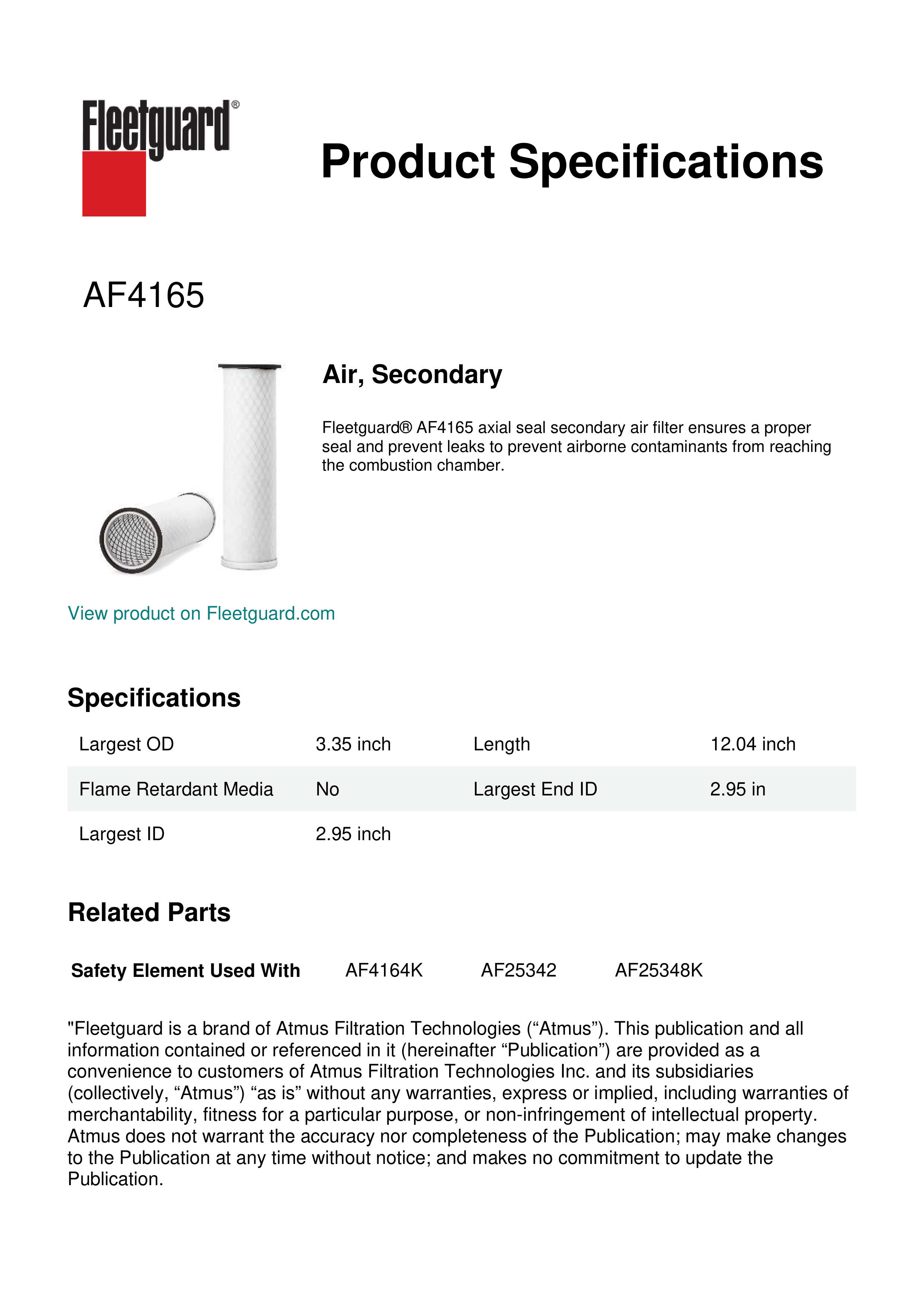 Fleetguard® AF4165 axial seal secondary air filter ensures a proper seal and prevent leaks to prevent airborne contaminants from reaching the combustion chamber.