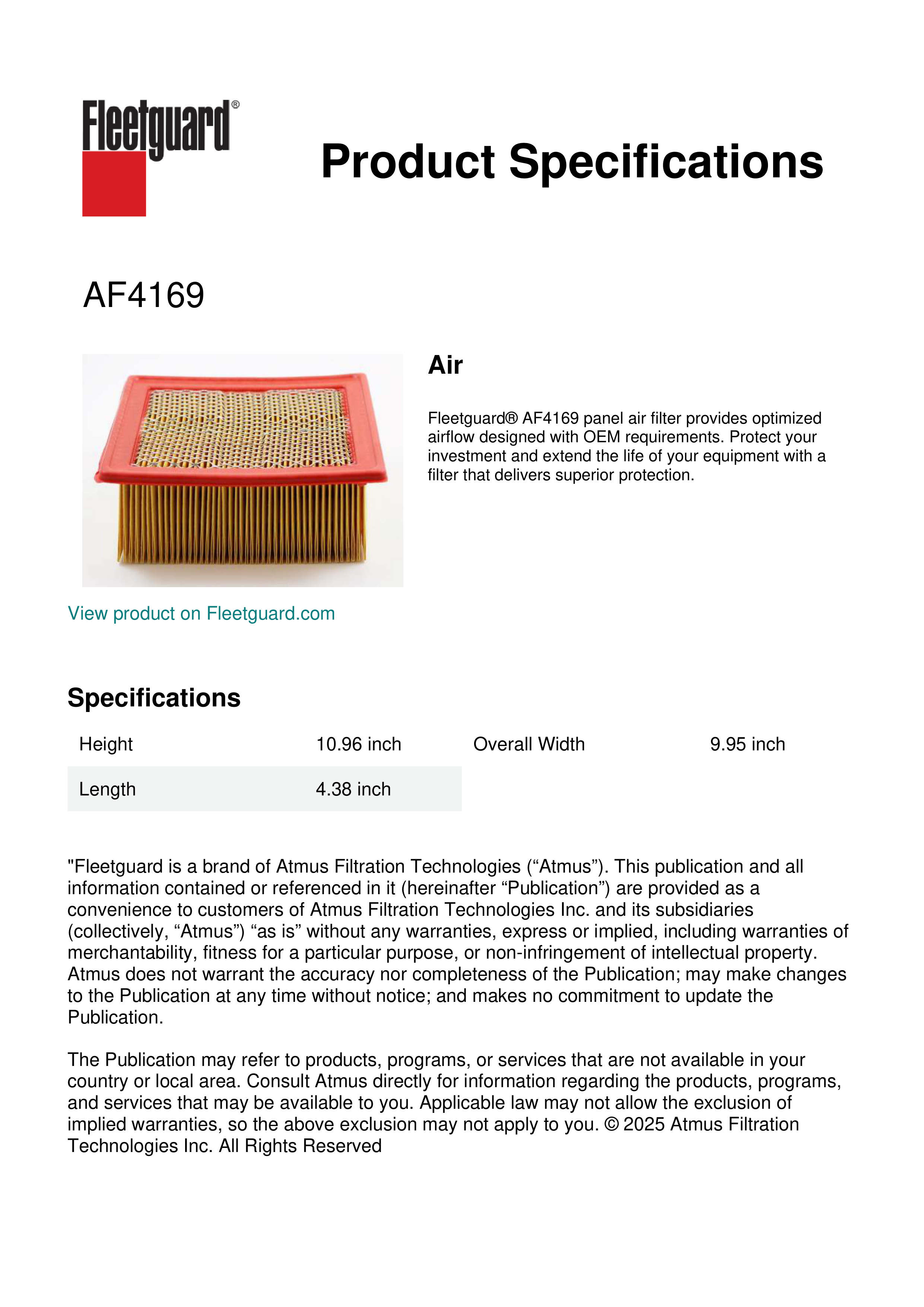 Fleetguard® AF4169 panel air filter provides optimized airflow designed with OEM requirements. Protect your investment and extend the life of your equipment with a filter that delivers superior protection.Specification
