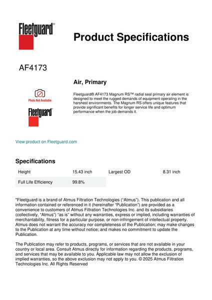 Fleetguard® AF4173 Magnum RS™ radial seal primary air element is designed to meet the rugged demands of equipment operating in the harshest environments. The Magnum RS offers unique features that provide significant benefits for longer service life and optimum performance when the job demands it.Specification