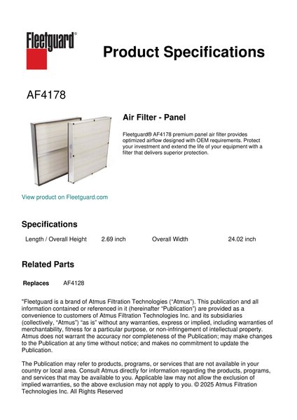 Fleetguard® AF4178 premium panel air filter provides optimized airflow designed with OEM requirements. Protect your investment and extend the life of your equipment with a filter that delivers superior protection.Specification
