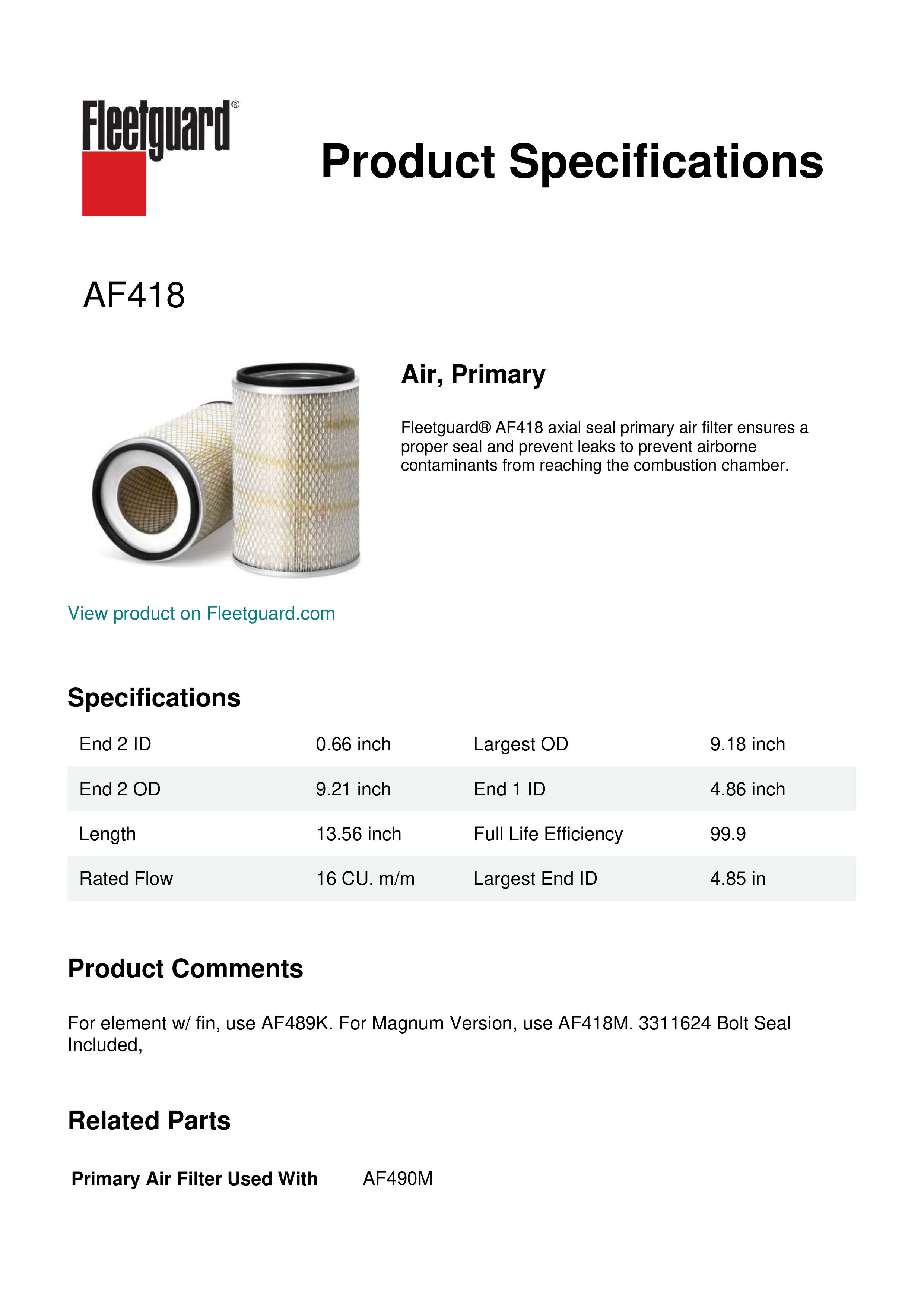 Fleetguard® AF418 axial seal primary air filter ensures a proper seal and prevent leaks to prevent airborne contaminants from reaching the combustion chamber.