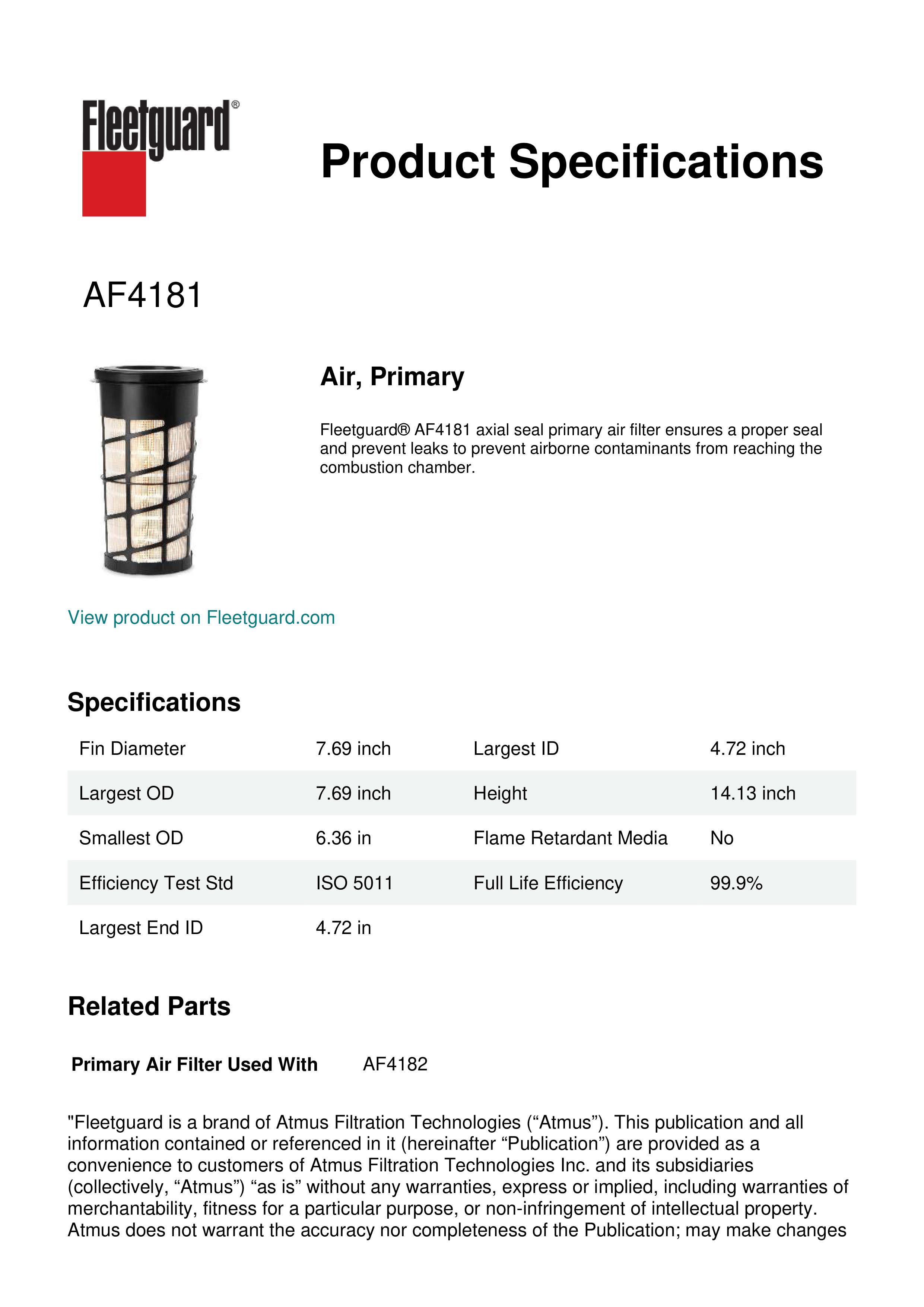 Fleetguard® AF4181 axial seal primary air filter ensures a proper seal and prevent leaks to prevent airborne contaminants from reaching the combustion chamber.