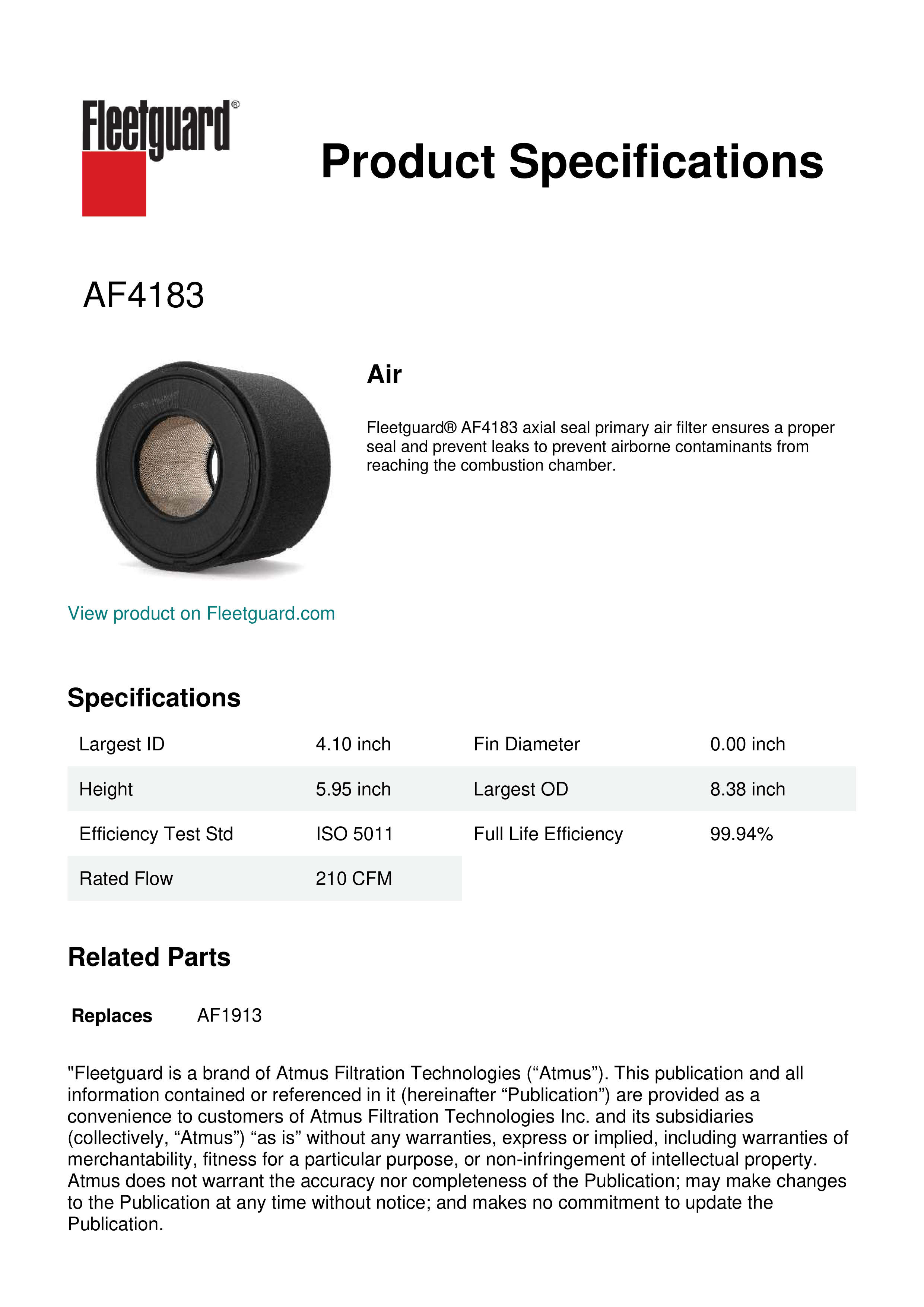 Fleetguard® AF4183 axial seal primary air filter ensures a proper seal and prevent leaks to prevent airborne contaminants from reaching the combustion chamber.