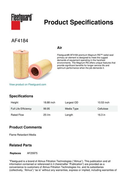 Fleetguard® AF4184 premium Magnum RS™ radial seal primary air element is designed to meet the rugged demands of equipment operating in the harshest environments. The Magnum RS offers unique features that provide significant benefits for longer service life and optimum performance when the job demands it.