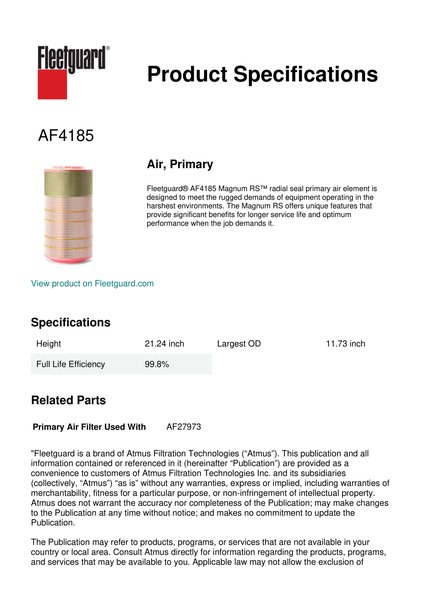 Fleetguard® AF4185 Magnum RS™ radial seal primary air element is designed to meet the rugged demands of equipment operating in the harshest environments. The Magnum RS offers unique features that provide significant benefits for longer service life and optimum performance when the job demands it.Specification