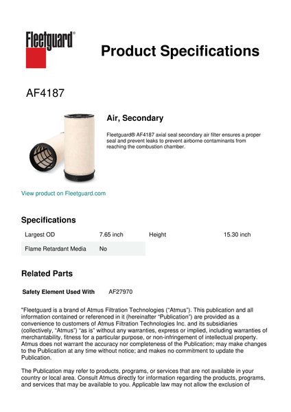 Fleetguard® AF4187 axial seal secondary air filter ensures a proper seal and prevent leaks to prevent airborne contaminants from reaching the combustion chamber.Specification