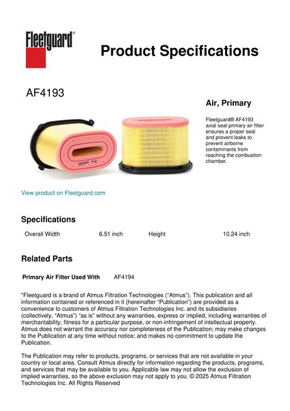 Fleetguard® AF4193 axial seal primary air filter ensures a proper seal and prevent leaks to prevent airborne contaminants from reaching the combustion chamber.
