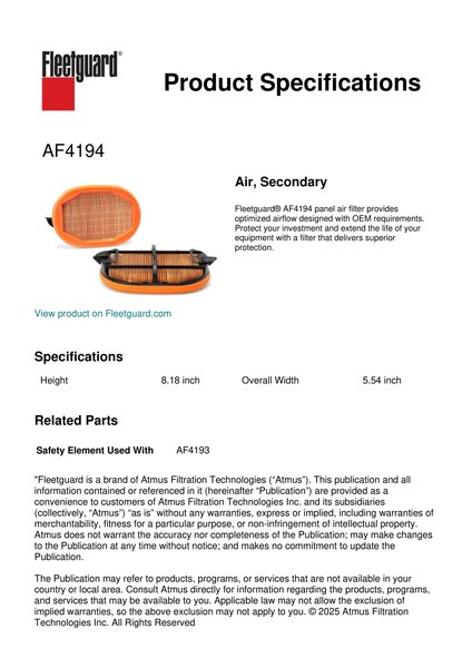 Fleetguard® AF4194 panel air filter provides optimized airflow designed with OEM requirements. Protect your investment and extend the life of your equipment with a filter that delivers superior protection.Specification
