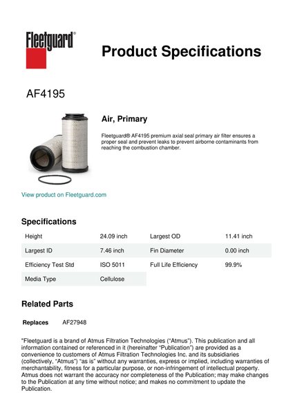 Fleetguard® AF4195 premium axial seal primary air filter ensures a proper seal and prevent leaks to prevent airborne contaminants from reaching the combustion chamber.