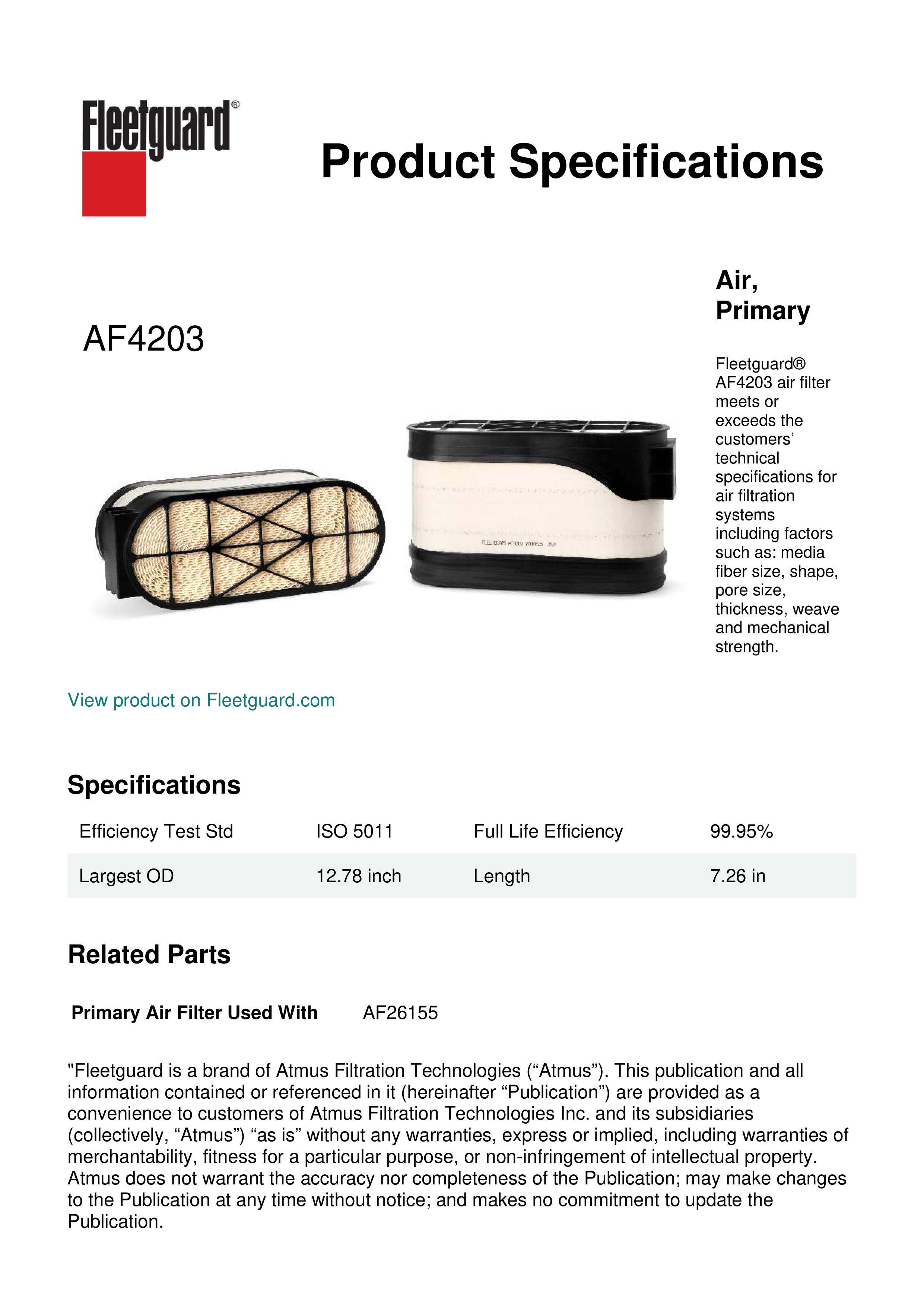 Fleetguard® AF4203 air filter meets or exceeds the customers’ technical specifications for air filtration systems including factors such as: media fiber size, shape, pore size, thickness, weave and mechanical strength.
