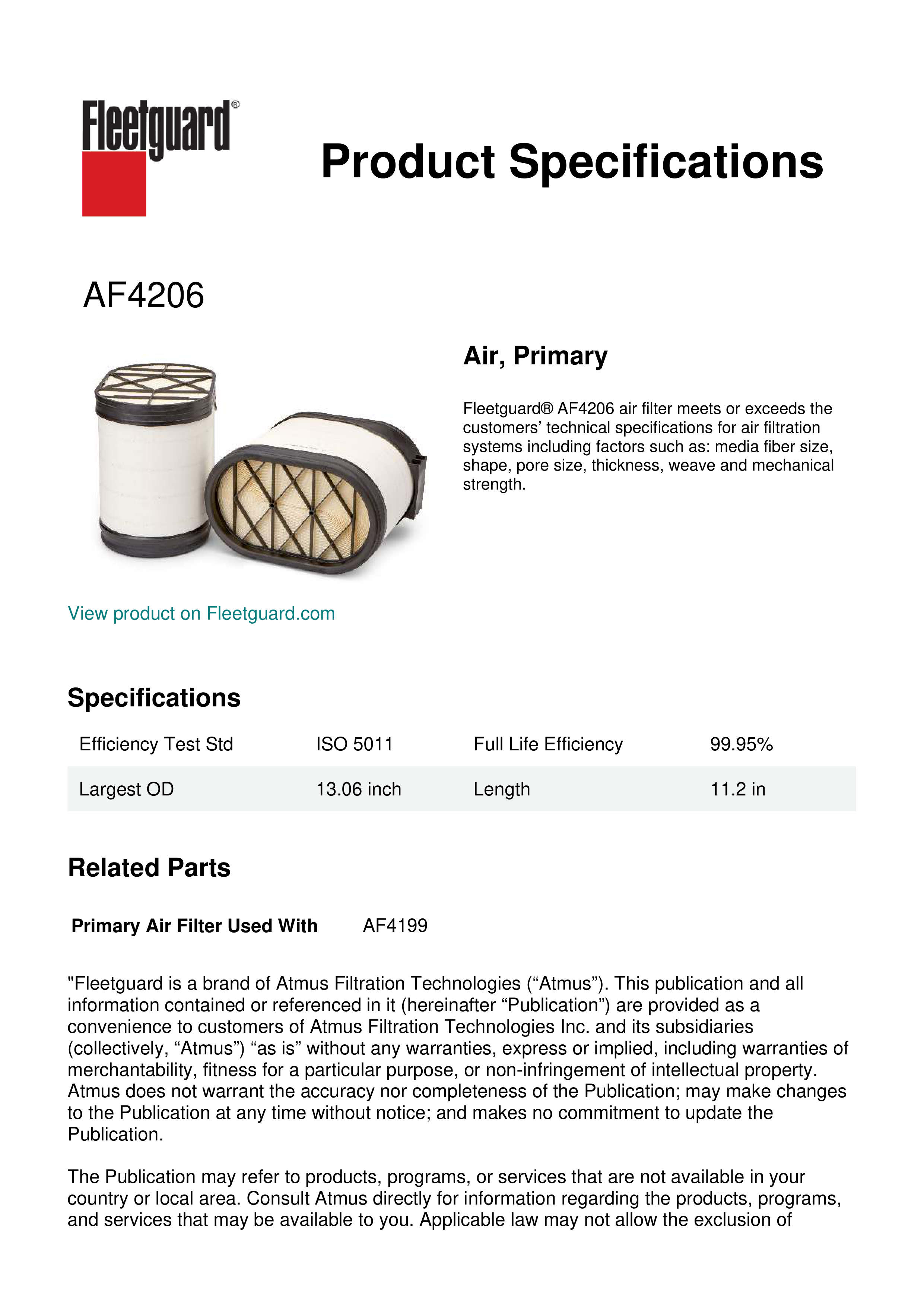 Fleetguard® AF4206 air filter meets or exceeds the customers’ technical specifications for air filtration systems including factors such as: media fiber size, shape, pore size, thickness, weave and mechanical strength.