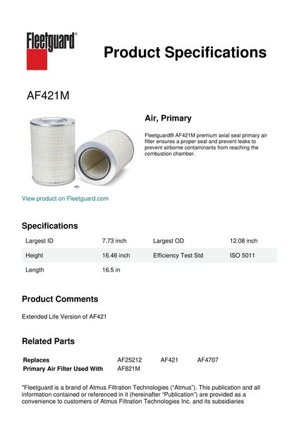 Fleetguard® AF421M premium axial seal primary air filter ensures a proper seal and prevent leaks to prevent airborne contaminants from reaching the combustion chamber.Specification