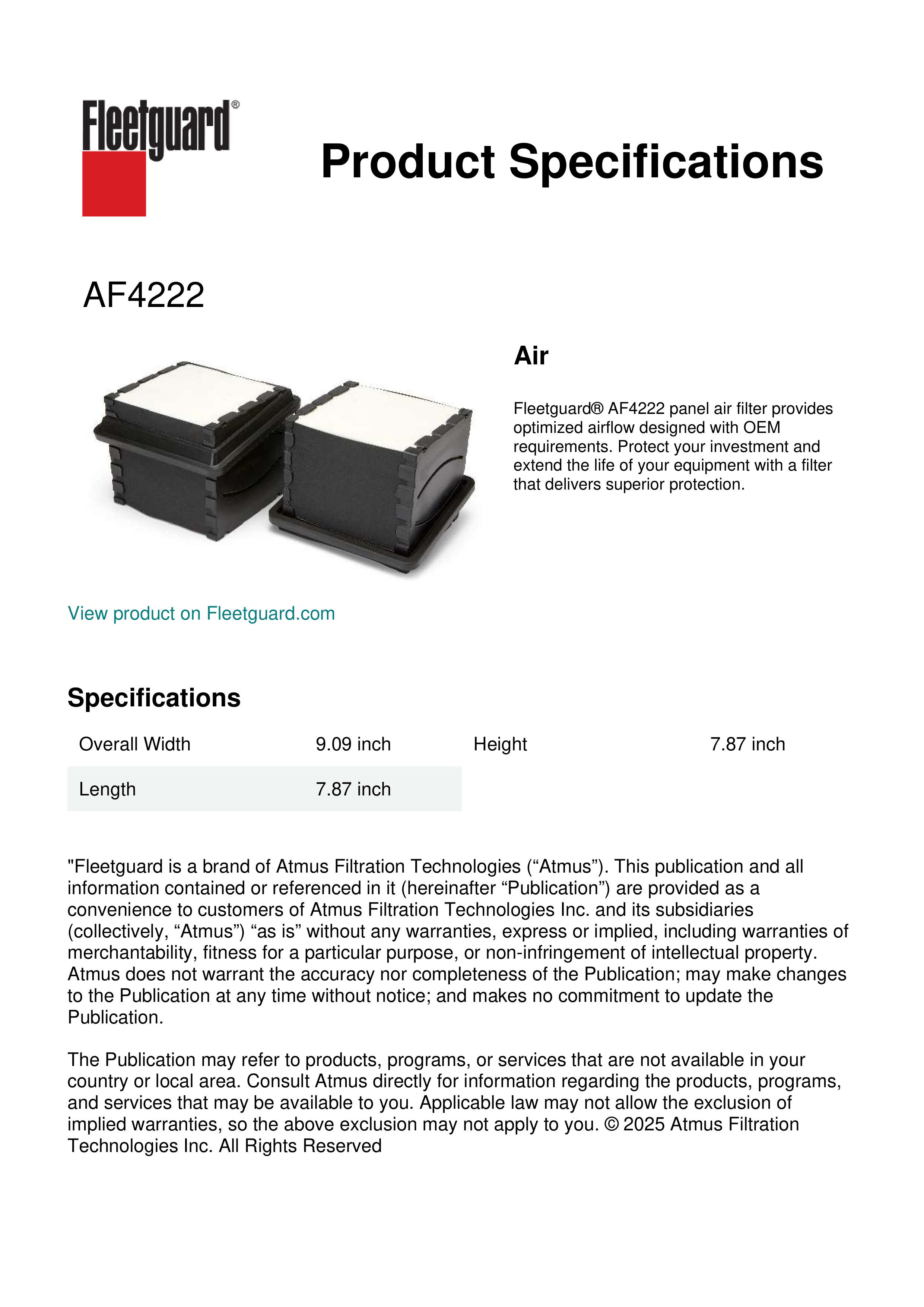 Fleetguard® AF4222 panel air filter provides optimized airflow designed with OEM requirements. Protect your investment and extend the life of your equipment with a filter that delivers superior protection.Specification