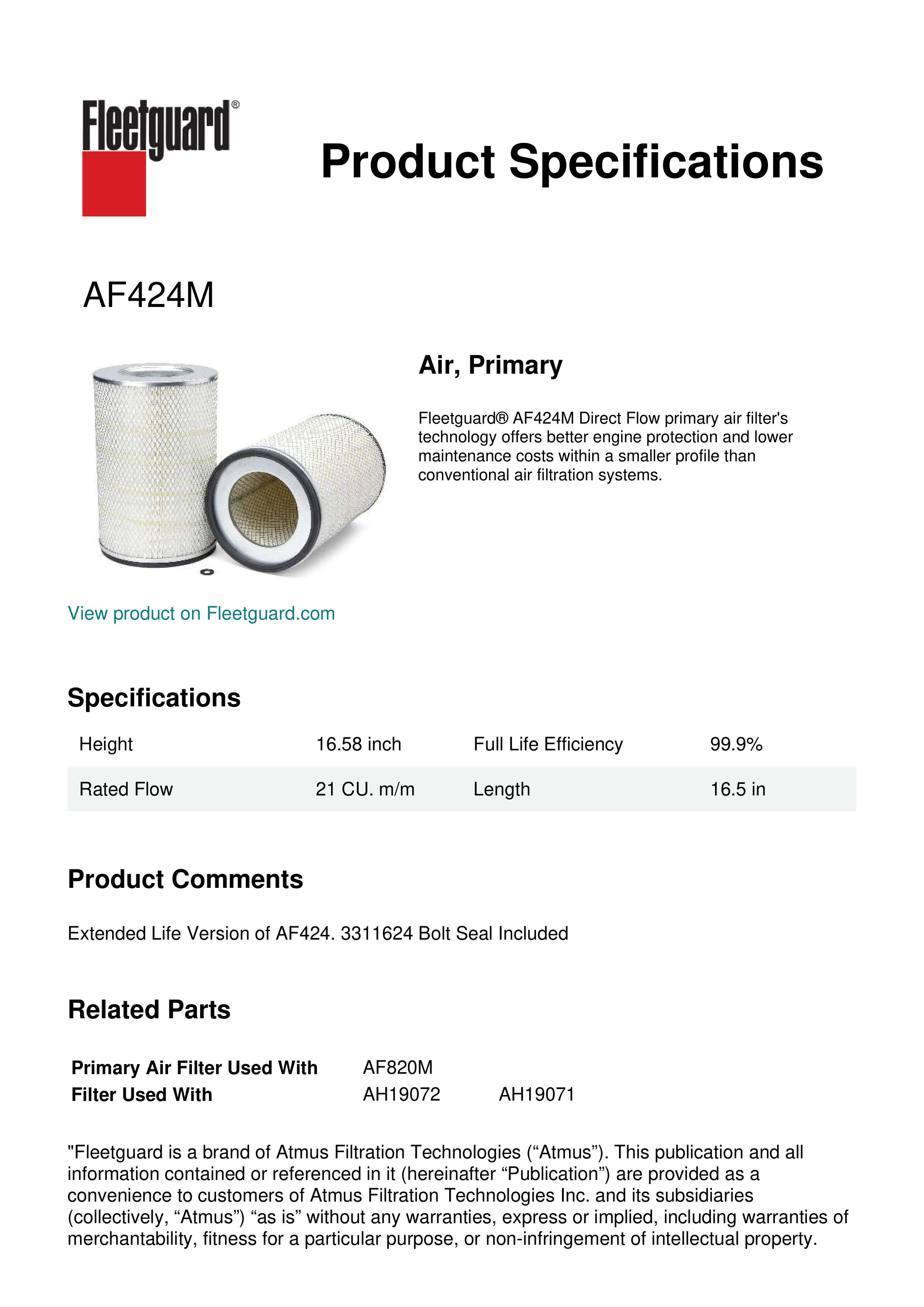 Fleetguard® AF424M Direct Flow primary air filter's technology offers better engine protection and lower maintenance costs within a smaller profile than conventional air filtration systems.Specification