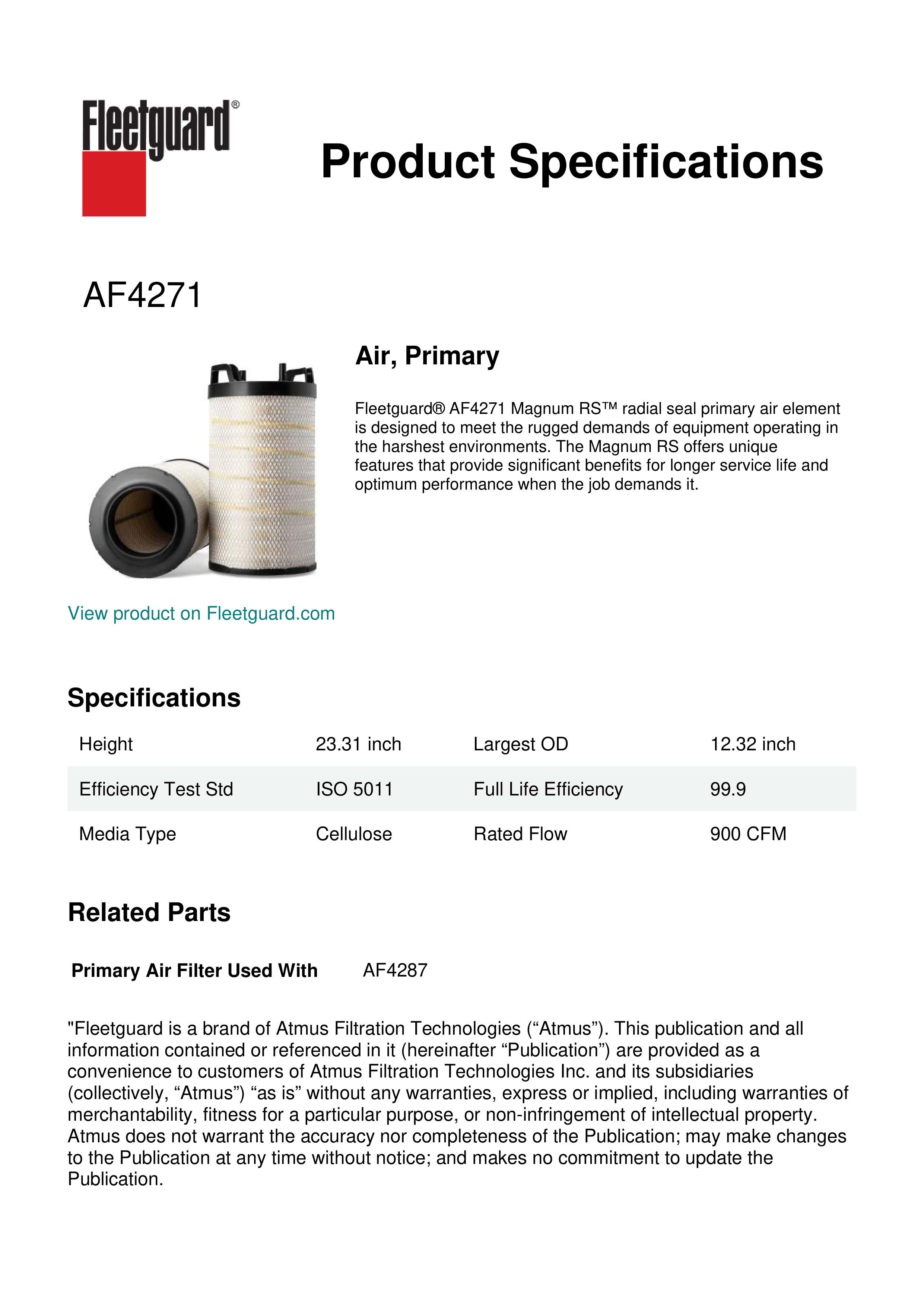 Fleetguard® AF4271 Magnum RS™ radial seal primary air element is designed to meet the rugged demands of equipment operating in the harshest environments. The Magnum RS offers unique features that provide significant benefits for longer service life and optimum performance when the job demands it.Specification