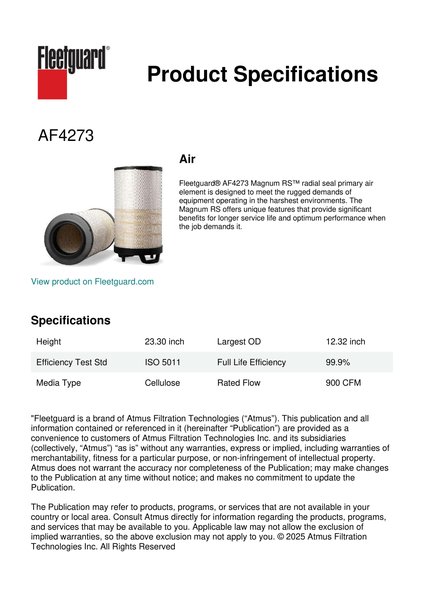 Fleetguard® AF4273 Magnum RS™ radial seal primary air element is designed to meet the rugged demands of equipment operating in the harshest environments. The Magnum RS offers unique features that provide significant benefits for longer service life and optimum performance when the job demands it.