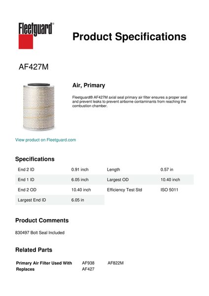 Fleetguard® AF427M axial seal primary air filter ensures a proper seal and prevent leaks to prevent airborne contaminants from reaching the combustion chamber.
