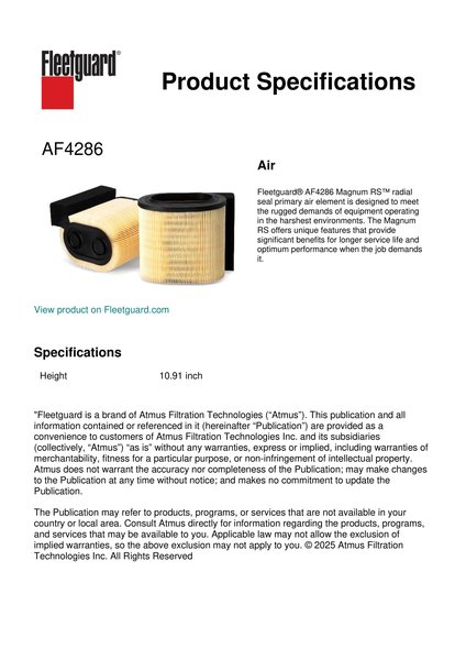 Fleetguard® AF4286 Magnum RS™ radial seal primary air element is designed to meet the rugged demands of equipment operating in the harshest environments. The Magnum RS offers unique features that provide significant benefits for longer service life and optimum performance when the job demands it.Specification