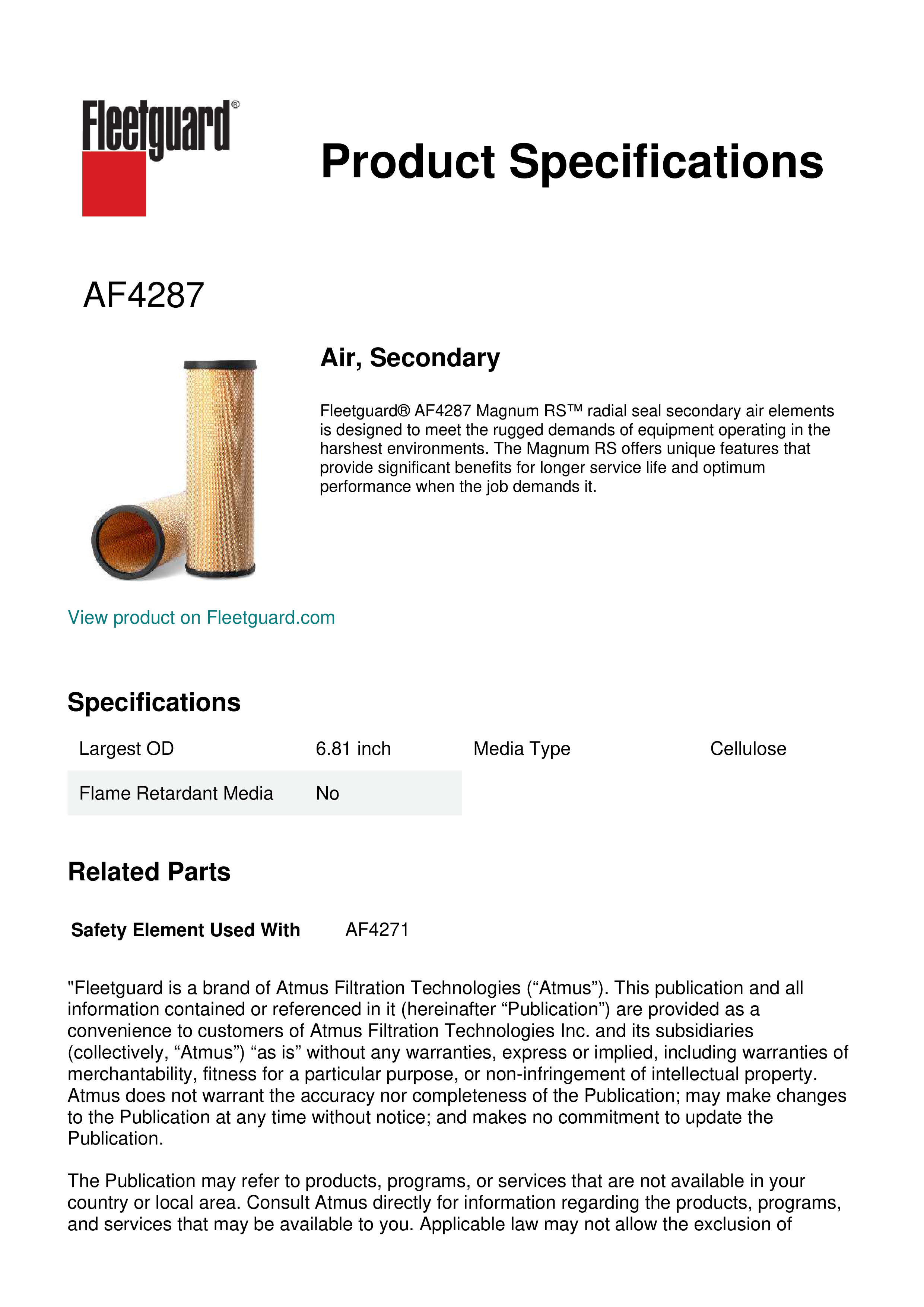 Fleetguard® AF4287 Magnum RS™ radial seal secondary air elements is designed to meet the rugged demands of equipment operating in the harshest environments. The Magnum RS offers unique features that provide significant benefits for longer service life and optimum performance when the job demands it.Specification