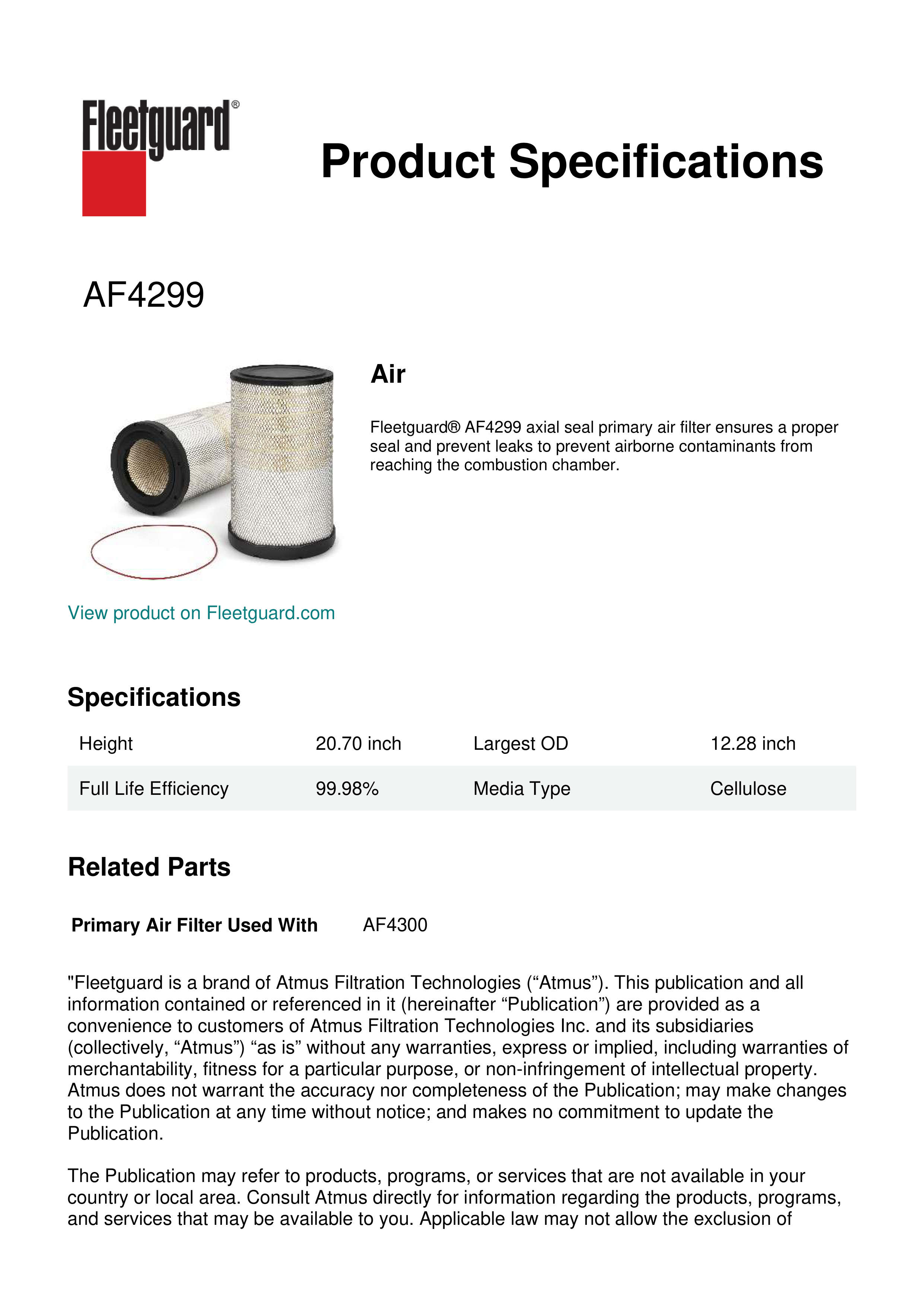 Fleetguard® AF4299 axial seal primary air filter ensures a proper seal and prevent leaks to prevent airborne contaminants from reaching the combustion chamber.