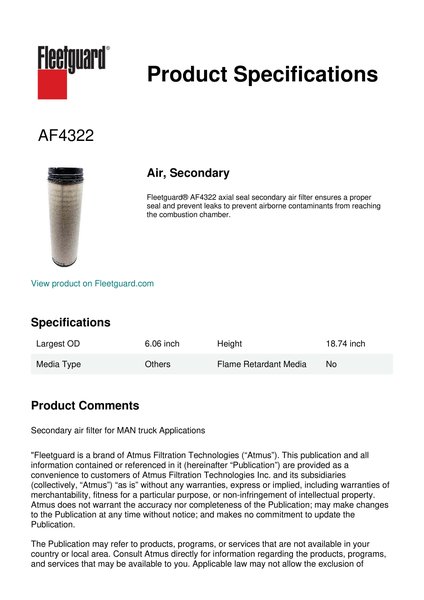 Fleetguard® AF4322 axial seal secondary air filter ensures a proper seal and prevent leaks to prevent airborne contaminants from reaching the combustion chamber.Specification