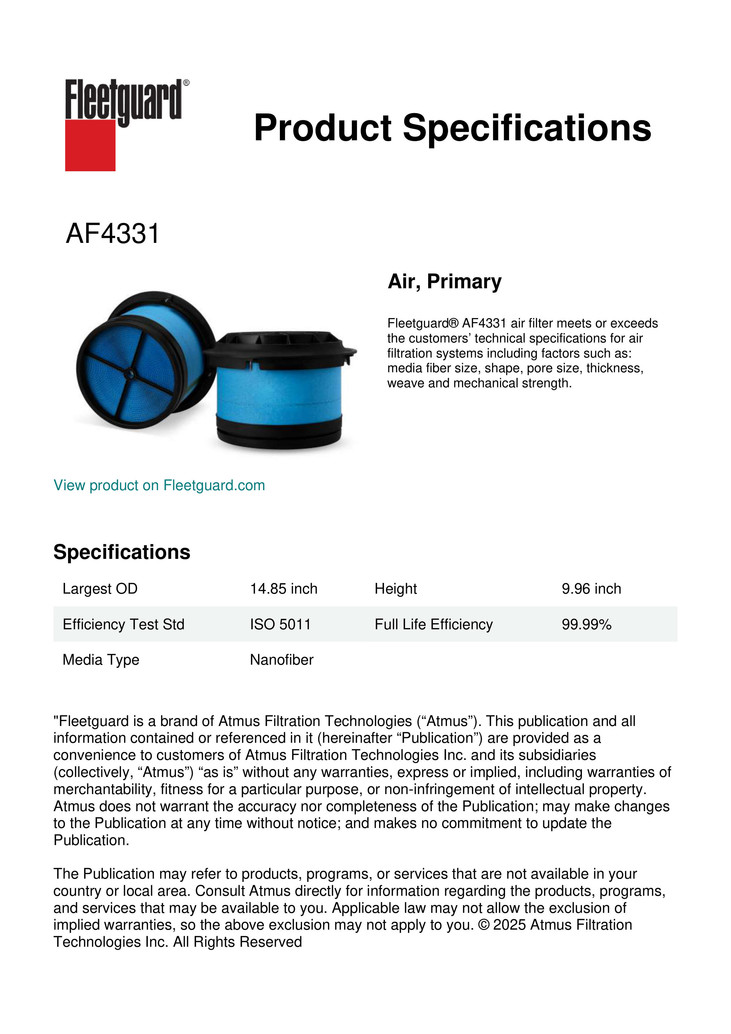 Fleetguard® AF4331 air filter meets or exceeds the customers’ technical specifications for air filtration systems including factors such as: media fiber size, shape, pore size, thickness, weave and mechanical strength.