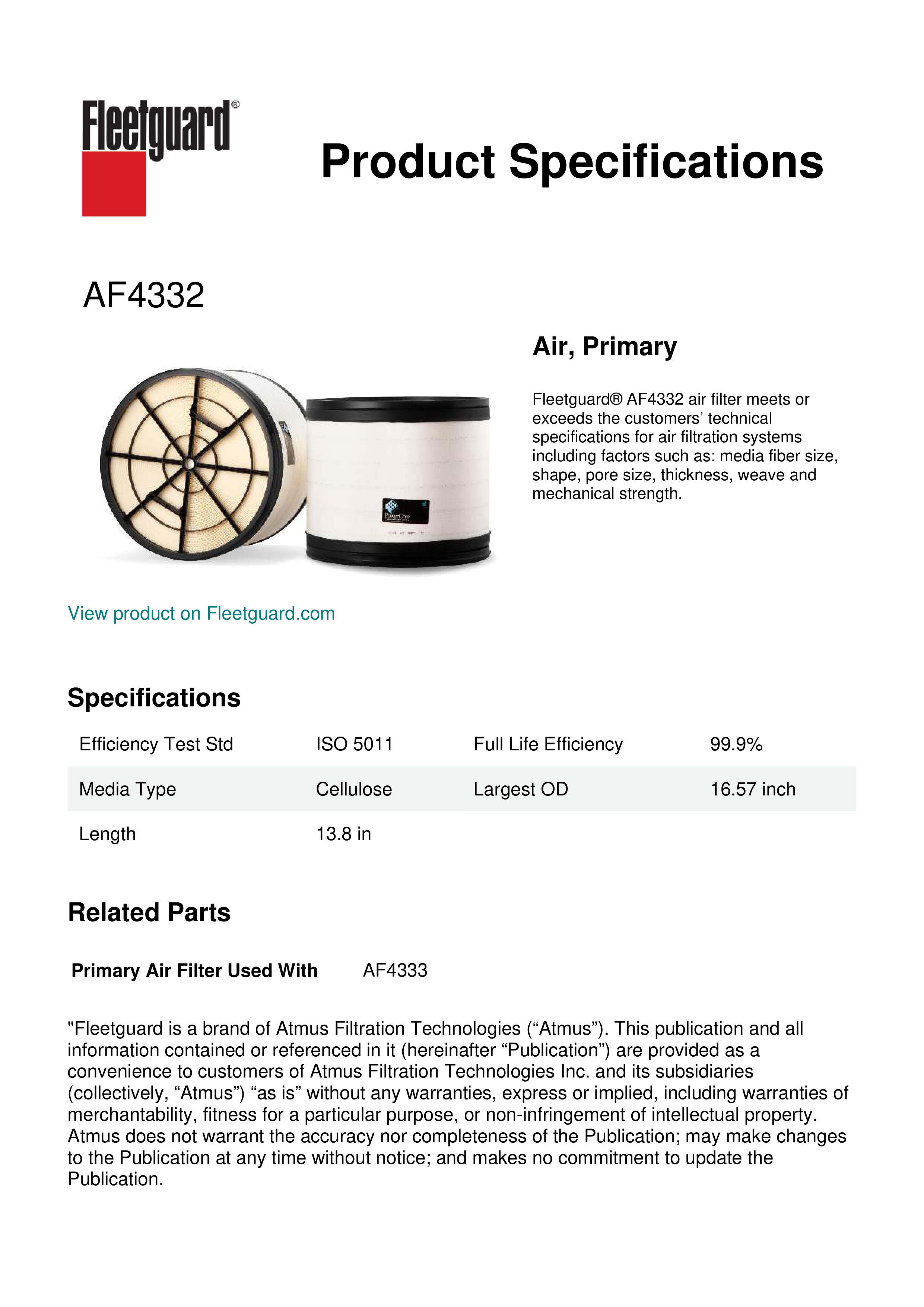 Fleetguard® AF4332 air filter meets or exceeds the customers’ technical specifications for air filtration systems including factors such as: media fiber size, shape, pore size, thickness, weave and mechanical strength.