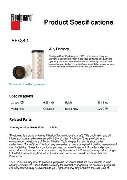 Fleetguard® AF4340 Magnum RS™ radial seal primary air element is designed to meet the rugged demands of equipment operating in the harshest environments. The Magnum RS offers unique features that provide significant benefits for longer service life and optimum performance when the job demands it.Specification