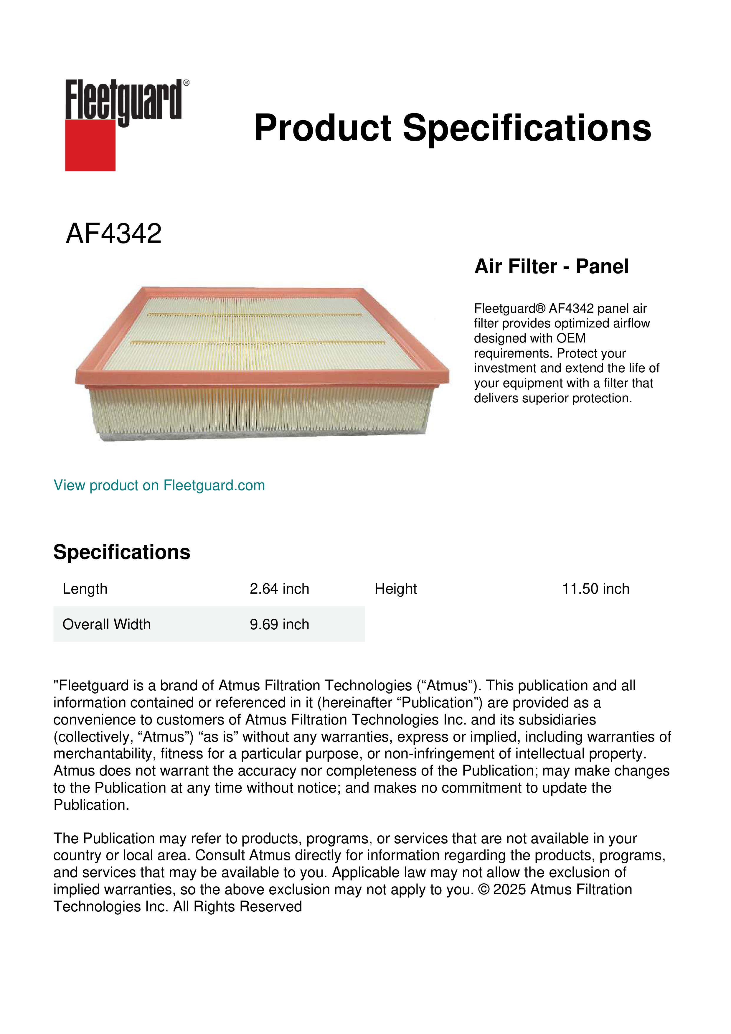 Fleetguard® AF4342 panel air filter provides optimized airflow designed with OEM requirements. Protect your investment and extend the life of your equipment with a filter that delivers superior protection.Specification