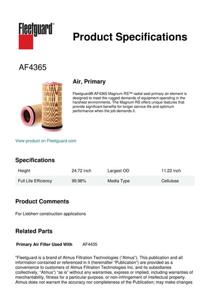 Fleetguard AF4365 Air, Primary
