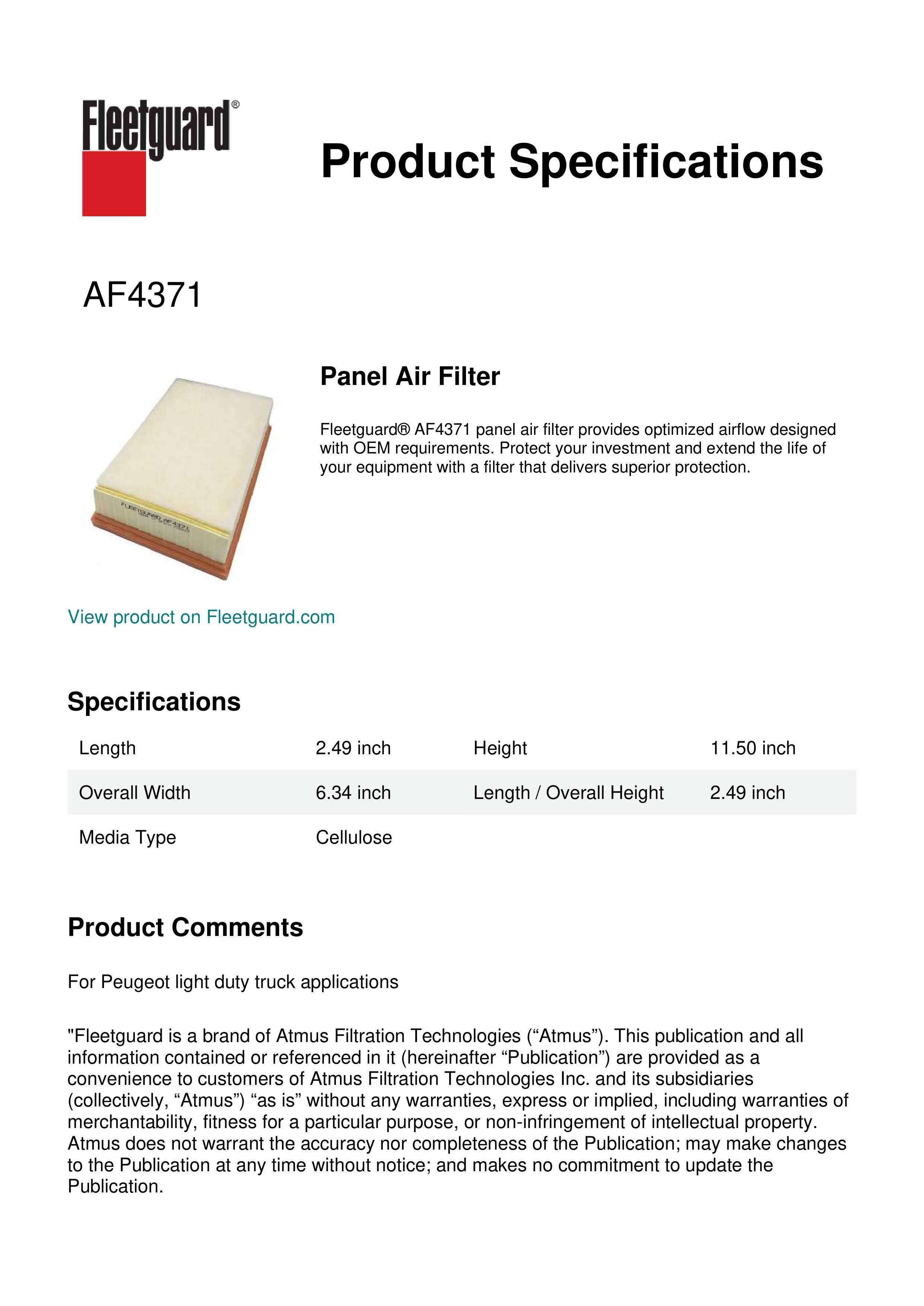 Fleetguard® AF4371 panel air filter provides optimized airflow designed with OEM requirements. Protect your investment and extend the life of your equipment with a filter that delivers superior protection.Specification