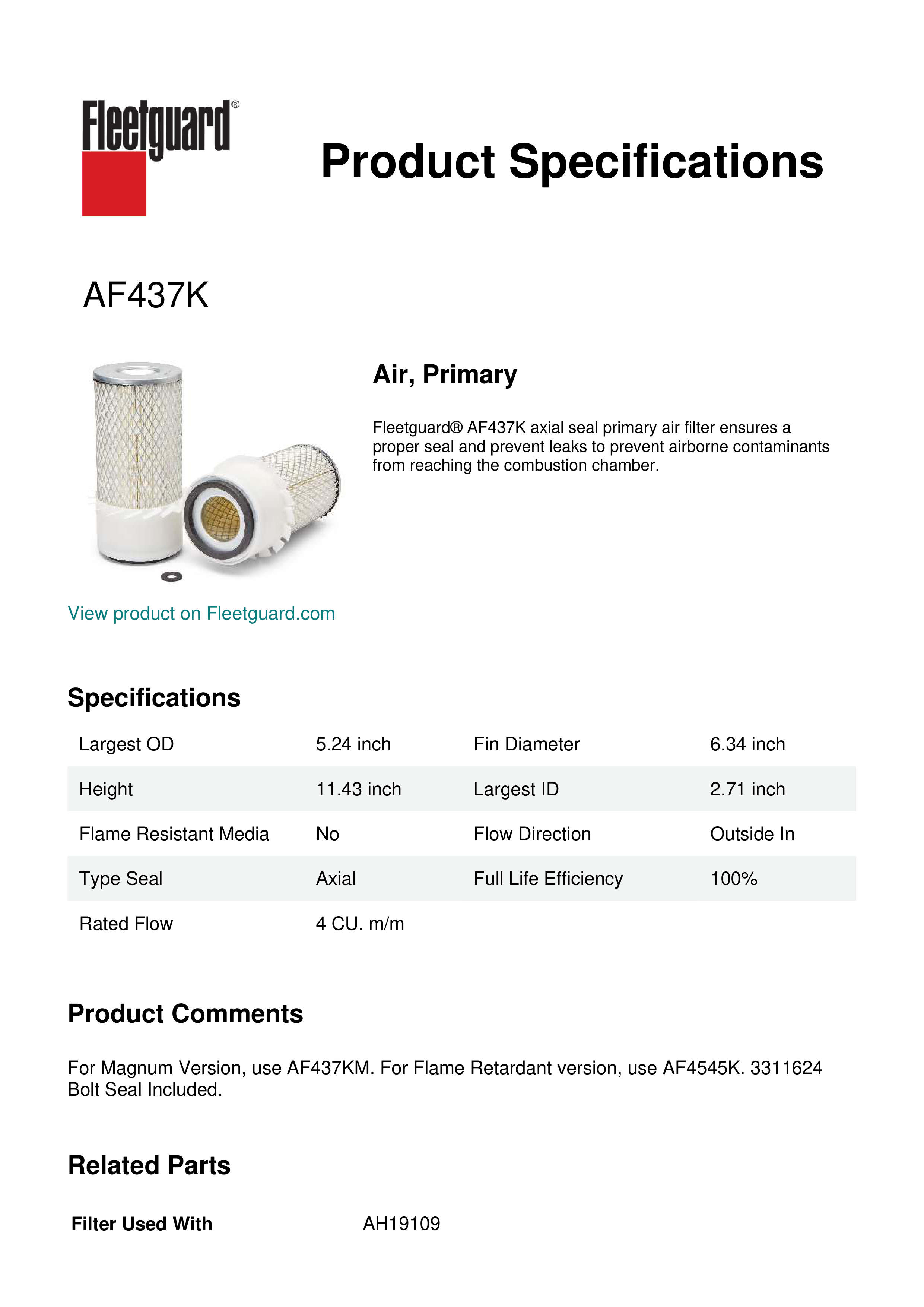 Fleetguard® AF437K axial seal primary air filter ensures a proper seal and prevent leaks to prevent airborne contaminants from reaching the combustion chamber.