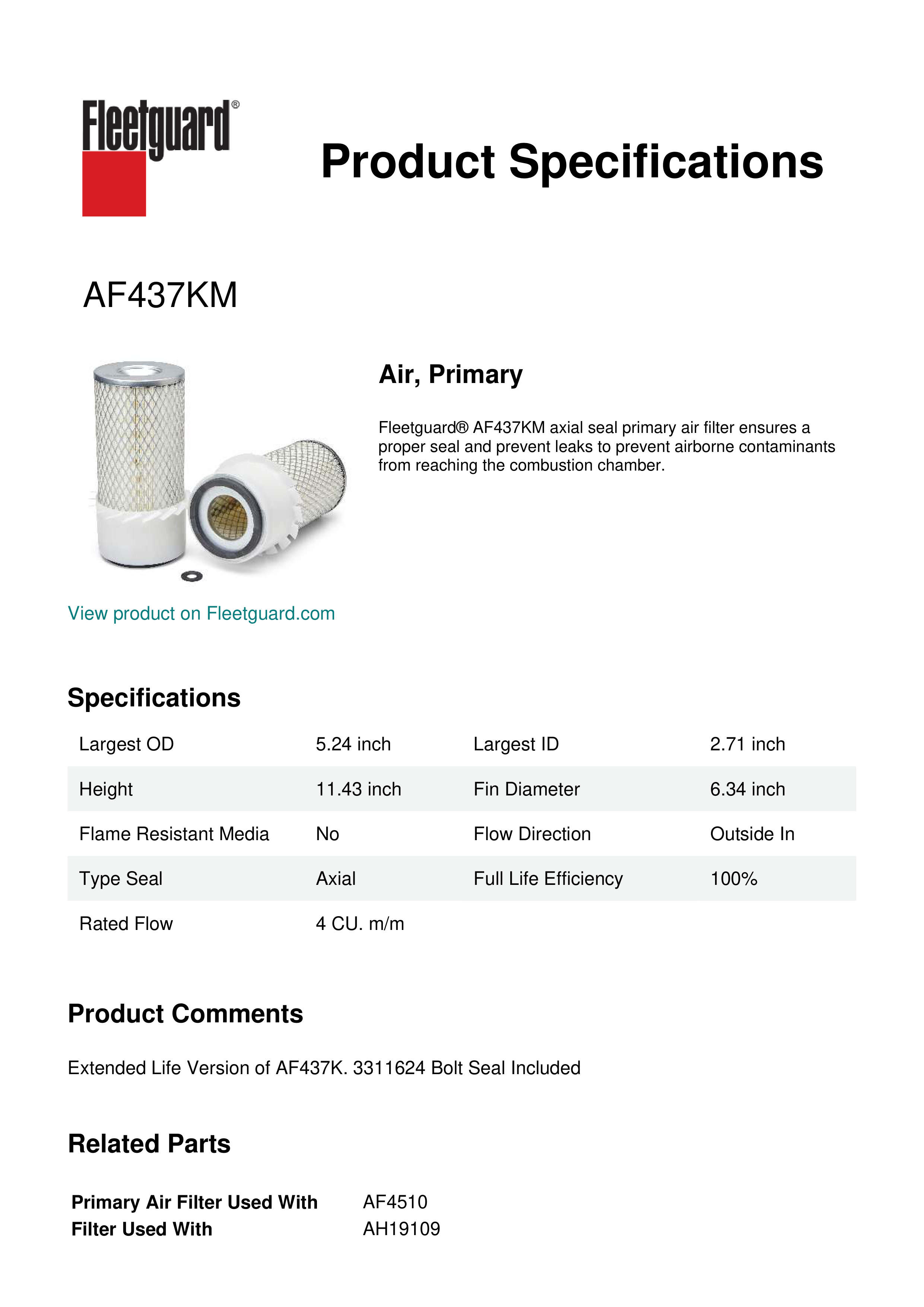 Fleetguard® AF437KM axial seal primary air filter ensures a proper seal and prevent leaks to prevent airborne contaminants from reaching the combustion chamber.Specification
