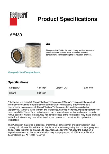 Fleetguard® AF439 axial seal primary air filter ensures a proper seal and prevent leaks to prevent airborne contaminants from reaching the combustion chamber.
