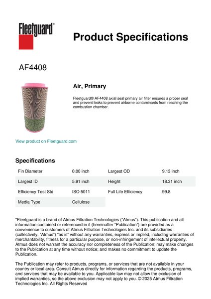 Fleetguard® AF4408 axial seal primary air filter ensures a proper seal and prevent leaks to prevent airborne contaminants from reaching the combustion chamber.