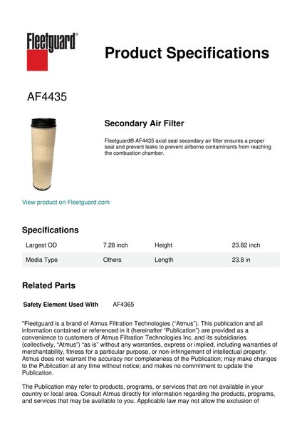 Fleetguard® AF4435 axial seal secondary air filter ensures a proper seal and prevent leaks to prevent airborne contaminants from reaching the combustion chamber.