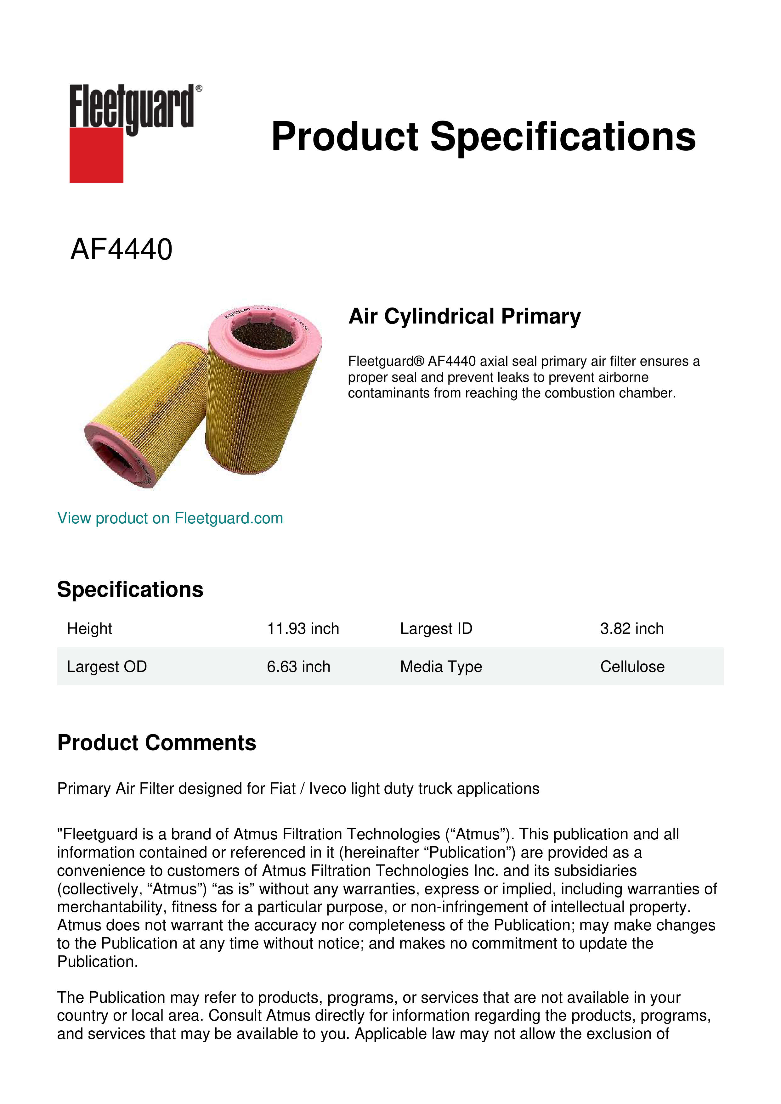 Fleetguard® AF4440 axial seal primary air filter ensures a proper seal and prevent leaks to prevent airborne contaminants from reaching the combustion chamber.Specification