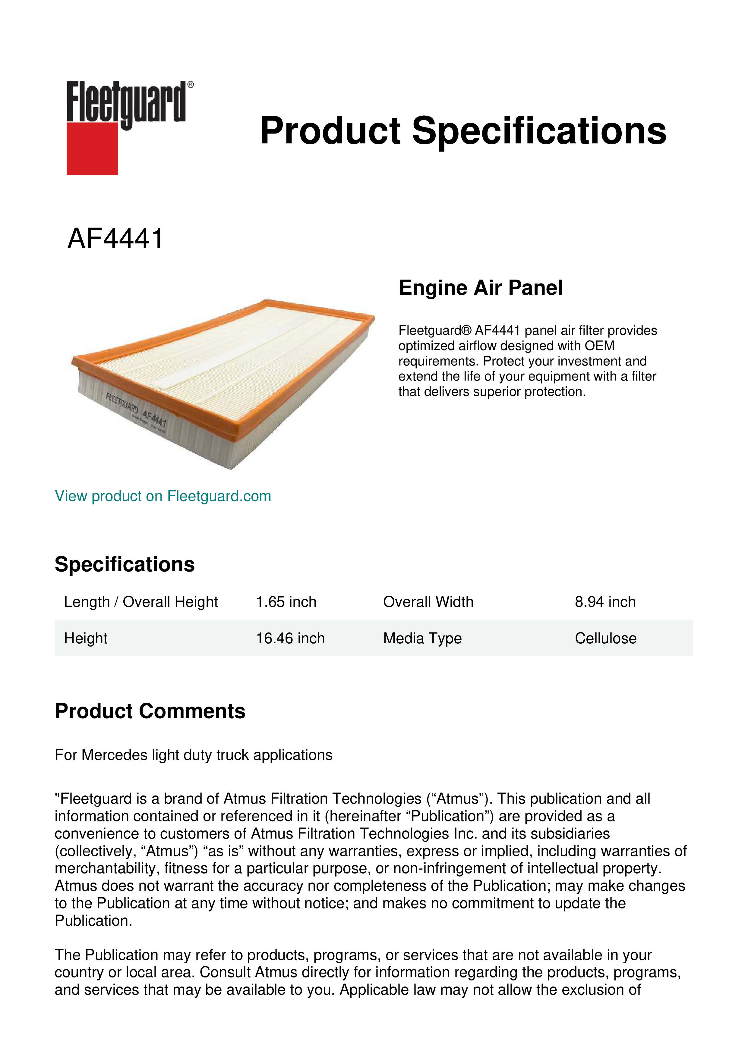 Fleetguard® AF4441 panel air filter provides optimized airflow designed with OEM requirements. Protect your investment and extend the life of your equipment with a filter that delivers superior protection.Specification