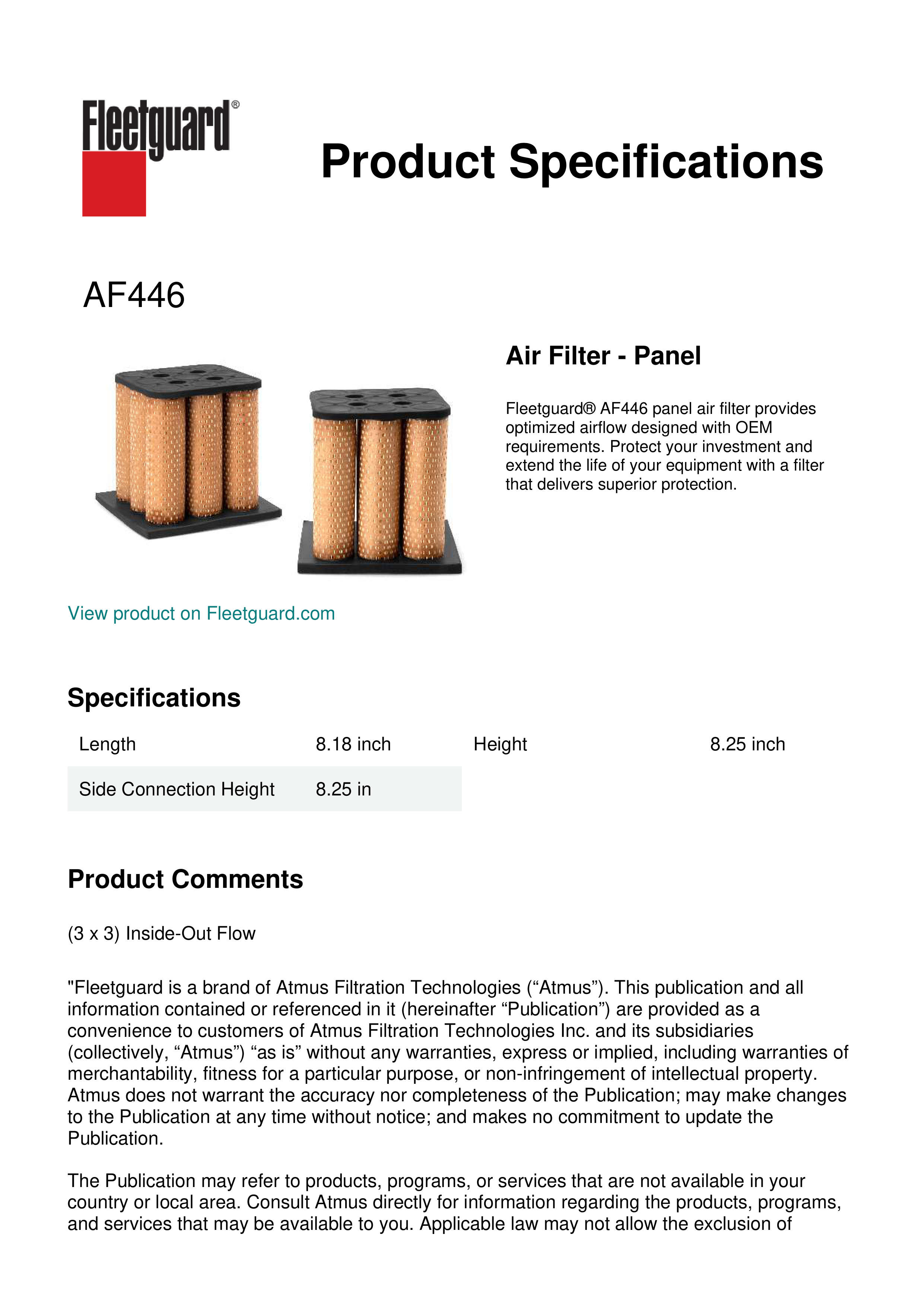 Fleetguard® AF446 panel air filter provides optimized airflow designed with OEM requirements. Protect your investment and extend the life of your equipment with a filter that delivers superior protection.Specification