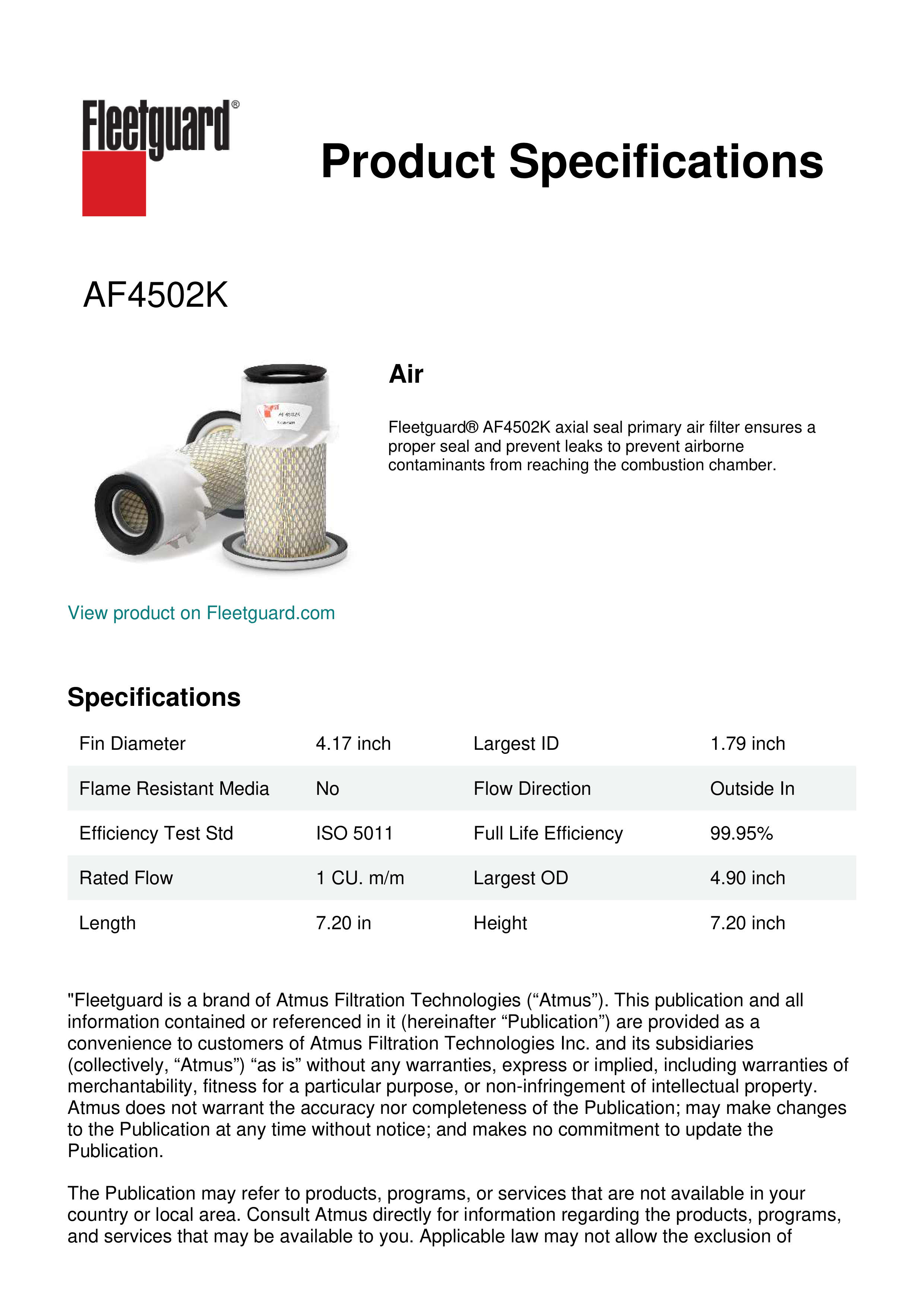 Fleetguard® AF4502K axial seal primary air filter ensures a proper seal and prevent leaks to prevent airborne contaminants from reaching the combustion chamber.Specification