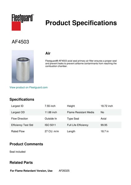 Fleetguard® AF4503 axial seal primary air filter ensures a proper seal and prevent leaks to prevent airborne contaminants from reaching the combustion chamber.