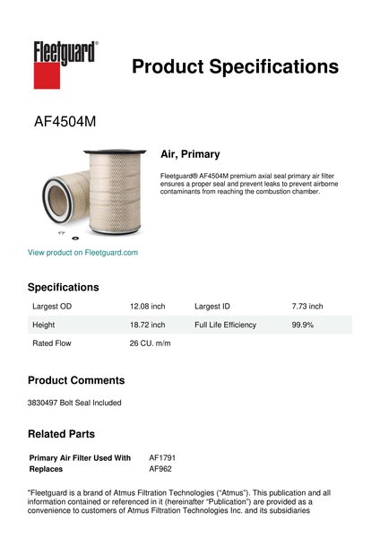 Fleetguard® AF4504M premium axial seal primary air filter ensures a proper seal and prevent leaks to prevent airborne contaminants from reaching the combustion chamber.