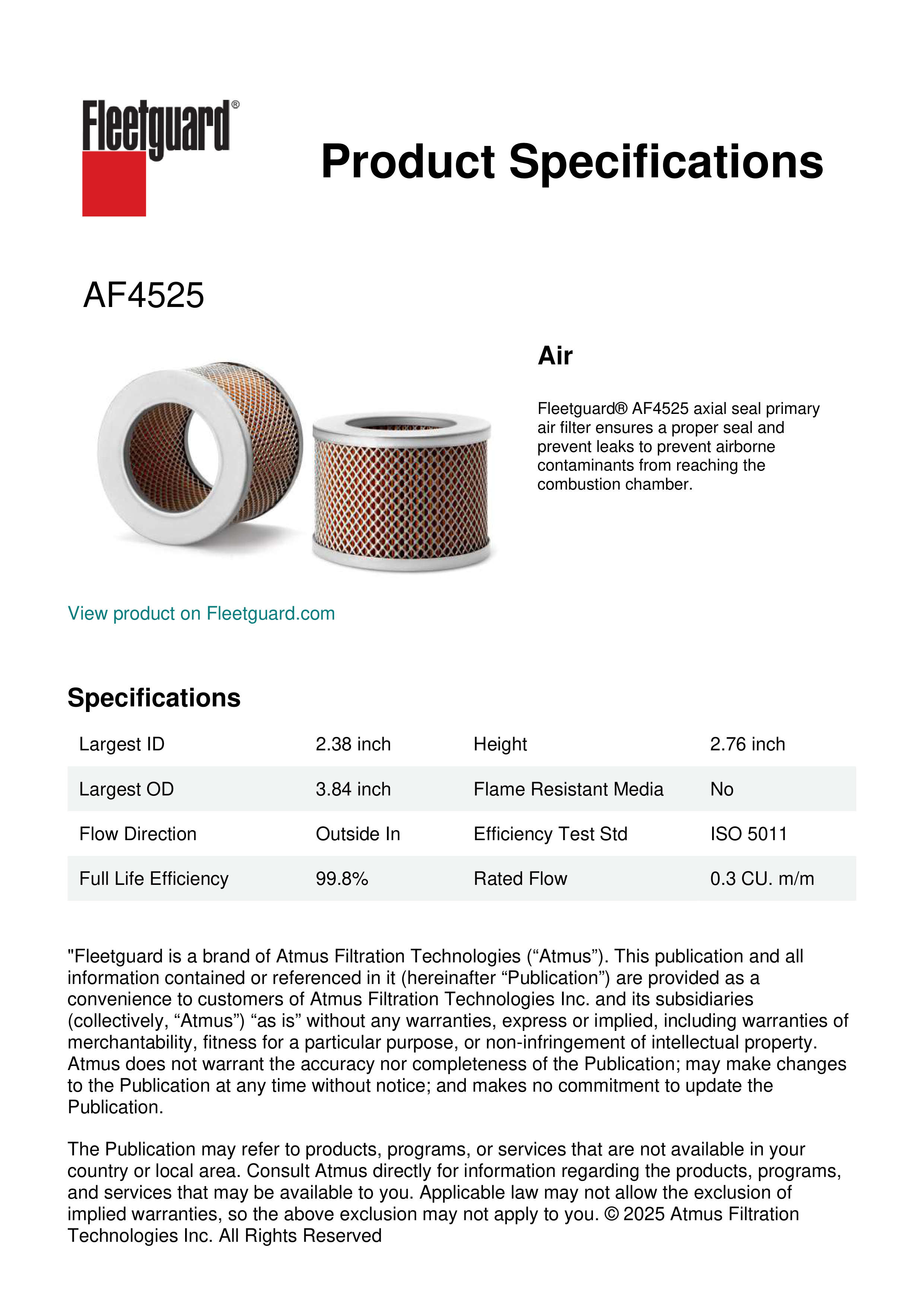 Fleetguard® AF4525 axial seal primary air filter ensures a proper seal and prevent leaks to prevent airborne contaminants from reaching the combustion chamber.