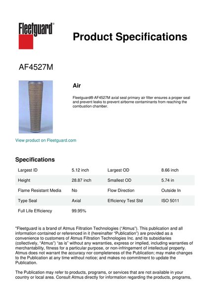 Fleetguard® AF4527M axial seal primary air filter ensures a proper seal and prevent leaks to prevent airborne contaminants from reaching the combustion chamber.