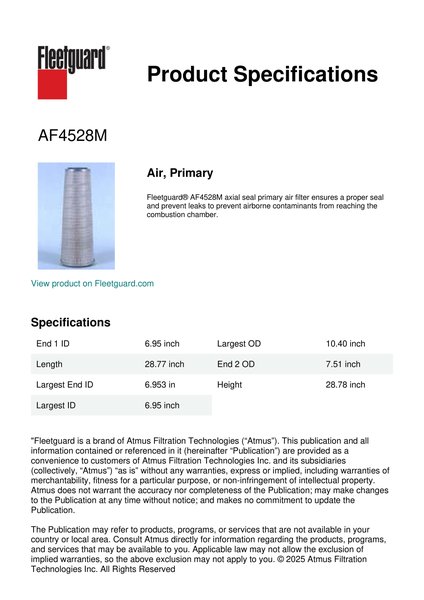 Fleetguard® AF4528M axial seal primary air filter ensures a proper seal and prevent leaks to prevent airborne contaminants from reaching the combustion chamber.Specification