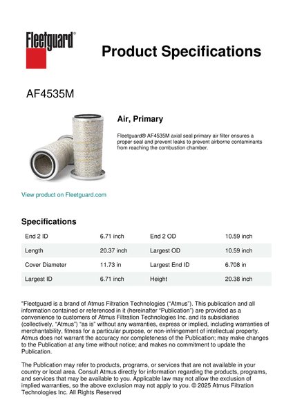 Fleetguard® AF4535M axial seal primary air filter ensures a proper seal and prevent leaks to prevent airborne contaminants from reaching the combustion chamber.
