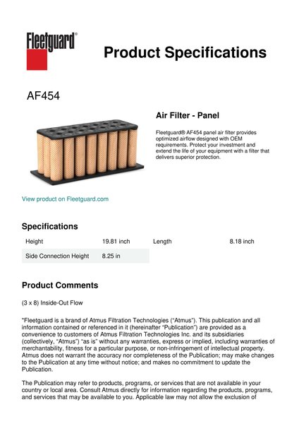Fleetguard® AF454 panel air filter provides optimized airflow designed with OEM requirements. Protect your investment and extend the life of your equipment with a filter that delivers superior protection.Specification