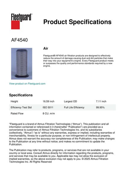 Fleetguard® AF4540 air filtration products are designed to effectively reduce the amount of damage-causing dust and dirt particles that make their way into your equipment’s engine. Every Fleetguard product meets or surpasses the quality and performance standards required by a new engine.Specification